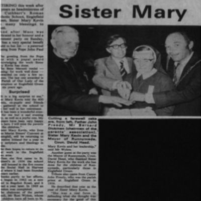 The school went from strength to strengthovertheyears. Many overseas residential trips were made. Strong links with the parish were maintained, including participation in the annual Crowning of the Virgin Mary procession. In 1974, the school's founder, Canon Preedy, moved from Englefield Green, and was replaced by a new parish priest, Fr Vann. In the school, additional classrooms andakitchenwerebuilt. When Sister Mary Kevin retired in 1979, over 400 past pupils, parents and friends attended her leaving party. Sister Olivia Hunt succeeded Sister Mary Kevin as headteacher - a post she held for 10 years.